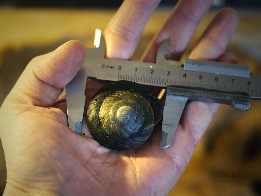 Je maintiens 2 de ces escargots en forme de Handpan. Ils ont environ 2 ans, et pour le moment leur coquille mesure déjà 4.5 cm de diamètre. Les adultes peuvent atteindre 6 voire 8 cm.