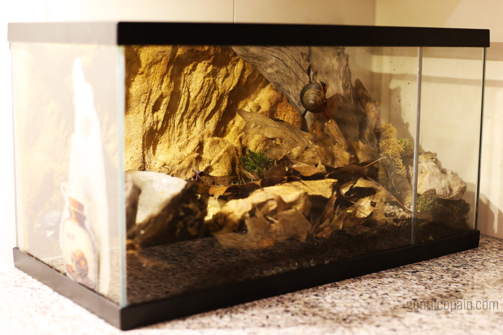70% à 90% d’humidité. Vaporisez, ou versez un peu d’eau directement sur le substrat régulièrement. Attention tout de même à ce que le substrat ne ressemble pas à de le boue ! Pour éviter cela, je préconise de déposer une couche du gravier au fond du terra. Ainsi, visuellement on arrive bien à voir si le fond et mouillé; de plus, le terra reste bien pourvu d’eau, sans détremper l’humus.