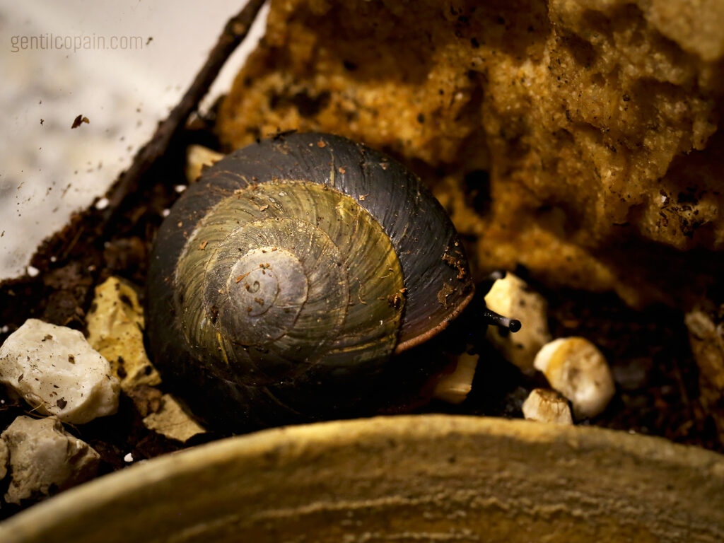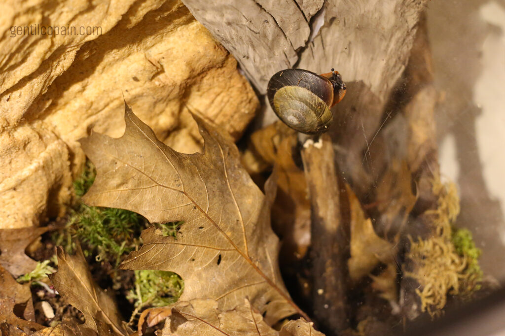 Il s’agit d’un escargot terrestre, dont la coquille a la particularité d’être aplatie. Je l’ai trouvé simplement joli ! Je n’avais jamais maintenu de gastéropodes avant… mon truc, c’est plutôt les serpents et les artropodes, c’est pas nouveau. Mais là, j’ai craqué. Ma fille m’avait déjà demandé à plusieurs reprises des escargots; et je dois dire que les immenses Achatina sp aperçus dans les bourses sont bien sympas, mais ne m’ont pas donné spécialement l’envie d’en maintenir : il me semble que ces derniers sont vite envahissants, et leur terrarium n’est pas … joli, à mon goût. Au vue de la taille de l’engin, de leur voracité… il me semble qu’ils ne peuvent pas évoluer dans un petit terrarium tout joli avec des mousses, et autres petites choses qui rendent, pour moi, la détention de nos bestioles jolies. Après… je parle peut-être sans savoir. Bref.
