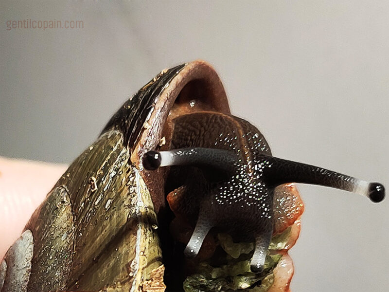 Ils mangent aussi des épluchures de carottes et éventuellement de patate douce. La salade proposée n’a pas pour le moment le succès escompté; la pomme non-plus. La banane par contre leur a plu. Je leur donne aussi des flocons pour poissons qu’ils mangent avec délectation. Je saupoudre très régulièrement leur repas avec du calcium. C’est important : ils en ont besoin pour leur coquille. Il y a différentes façons de leur en proposer. Personnellement, je garde les coquilles d’oeufs, je les nettoie, les sèche et les réduis en poudre dans un mortier. Et vous savez quoi !? C’est hyper satisfaisant à faire ! Comme spécifié dans le paragraphe sur le substrat, je leur propose aussi de la roche calcaire et des os de sépias.